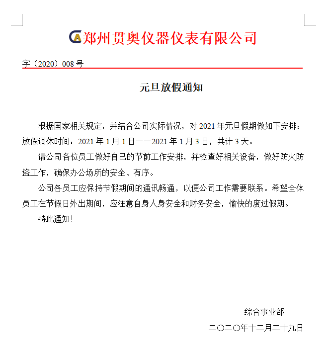 2021年元旦佳節(jié)將至,首先向全體員工致以節(jié)日的問候,為了大家能度過歡樂、祥和、平安的節(jié)日,特提醒全體人員注意以下幾點: