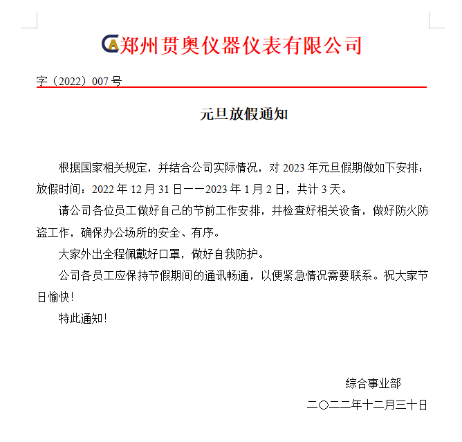 2023年元旦佳節(jié)將至,首先向全體員工致以節(jié)日的問候,為了大家能度過歡樂、祥和、平安的節(jié)日,特提醒全體人員注意以下幾點: