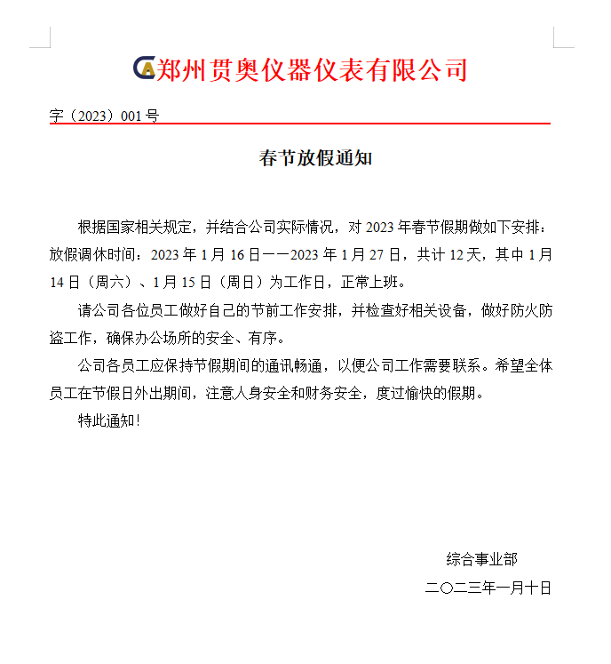 在此,感謝大家在過去一年里對(duì)鄭州貫奧儀器儀表有限公司的支持與信任。同時(shí)也希望在新的一年里,鄭州貫奧儀器儀表有限公司能繼續(xù)得到大家的關(guān)注及支持,并且鄭州貫奧儀器儀表有限公司也會(huì)一如既往地為大家提供更好的產(chǎn)品和服務(wù)!
