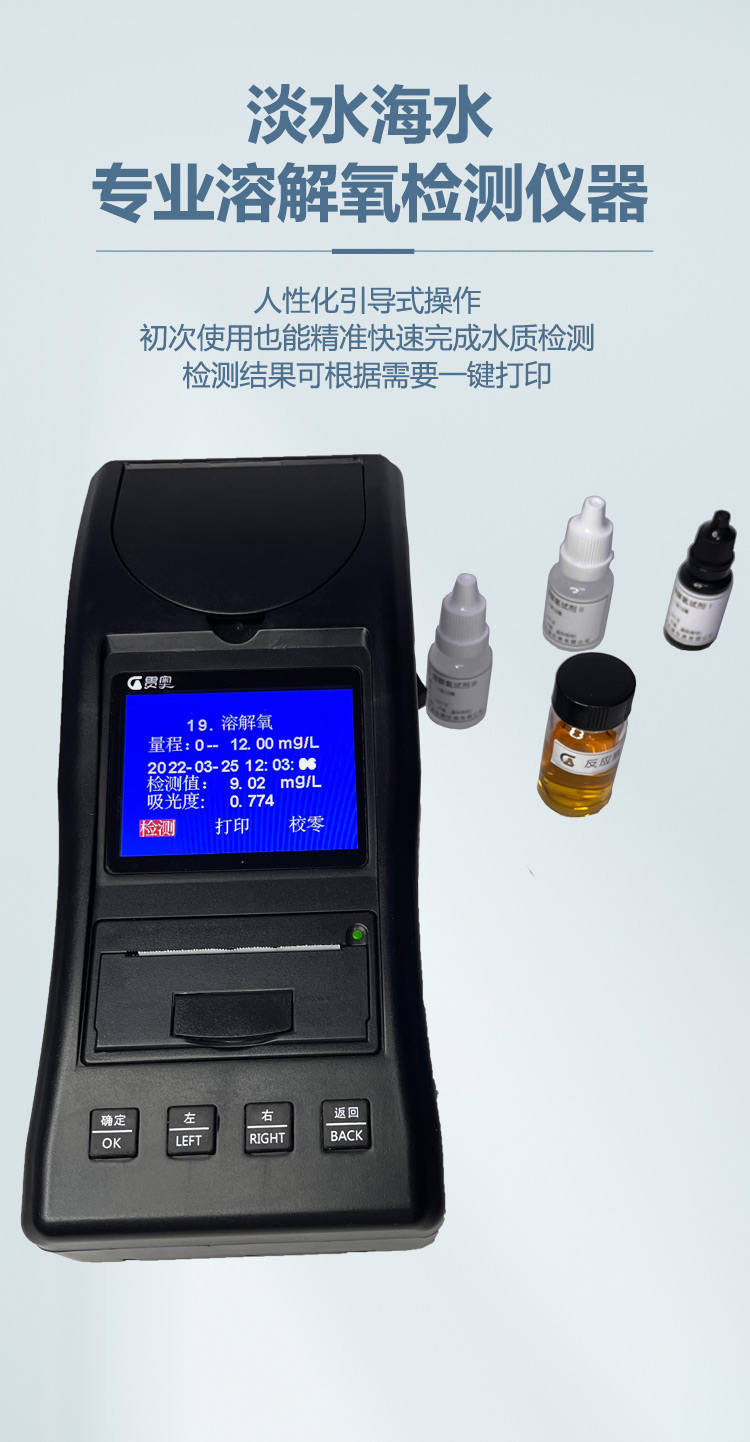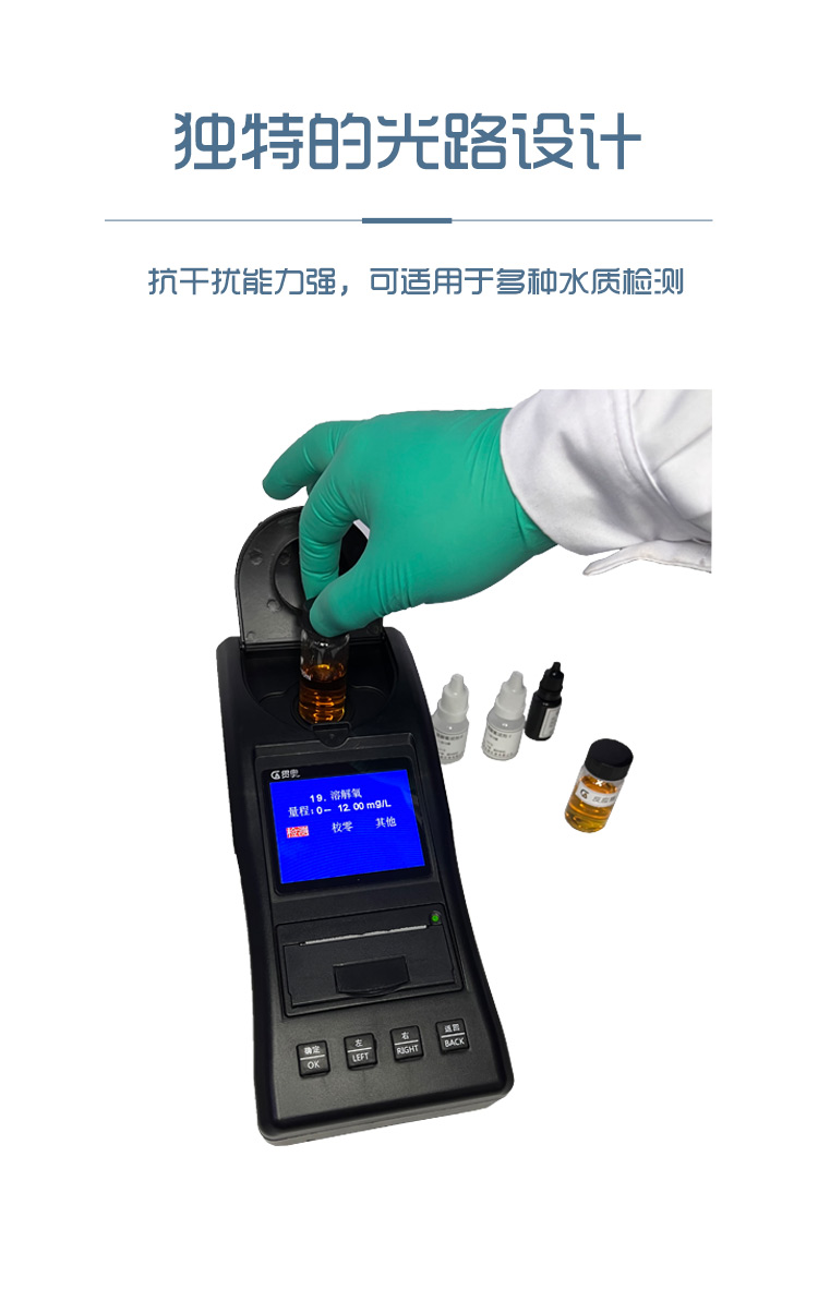 3、溶解氧測(cè)試儀采用分光光度的光電比色原理,操作簡(jiǎn)便,取水樣放入試劑反應(yīng)幾分鐘即可讀數(shù),重復(fù)性≤±2%。