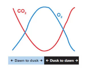 當DO水平最低時,二氧化碳水平(和毒性)最高(圖2)。因此,黎明是監(jiān)測DO和CO 2的關(guān)鍵時刻。高CO 2濃度抑制魚和蝦從水中提取O 2的能力,降低對低O 2條件的耐受性,并誘導與窒息相當?shù)膽ぁ?/span>